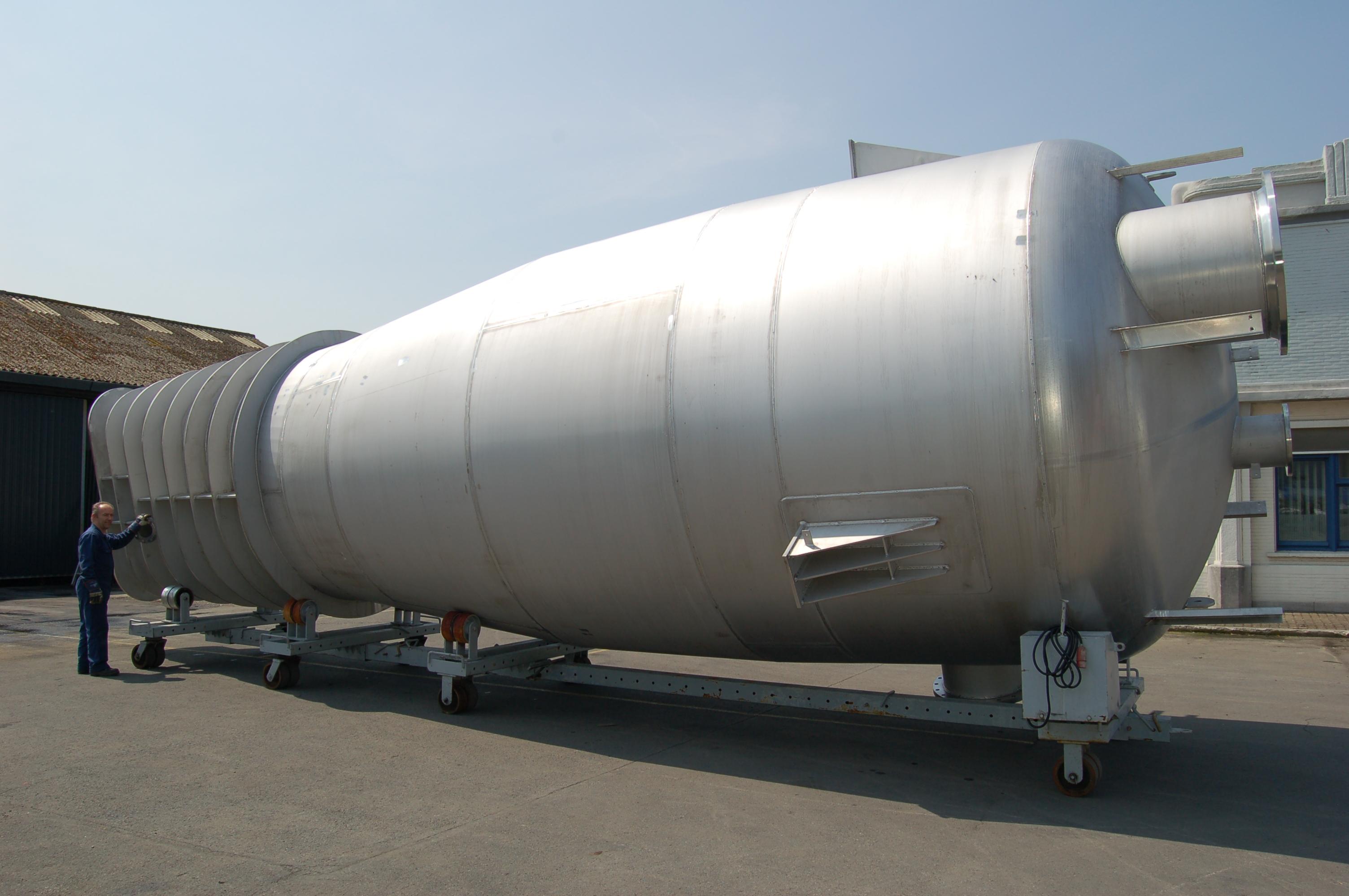 Buffer silo with a diameter of 3500mm. Material: INOX 304 L Diameter: 3500 mm Height: 11550 mm Thickness: 8 mm Pressure: -0,1/+0,01 barg Weight: 11000 kg